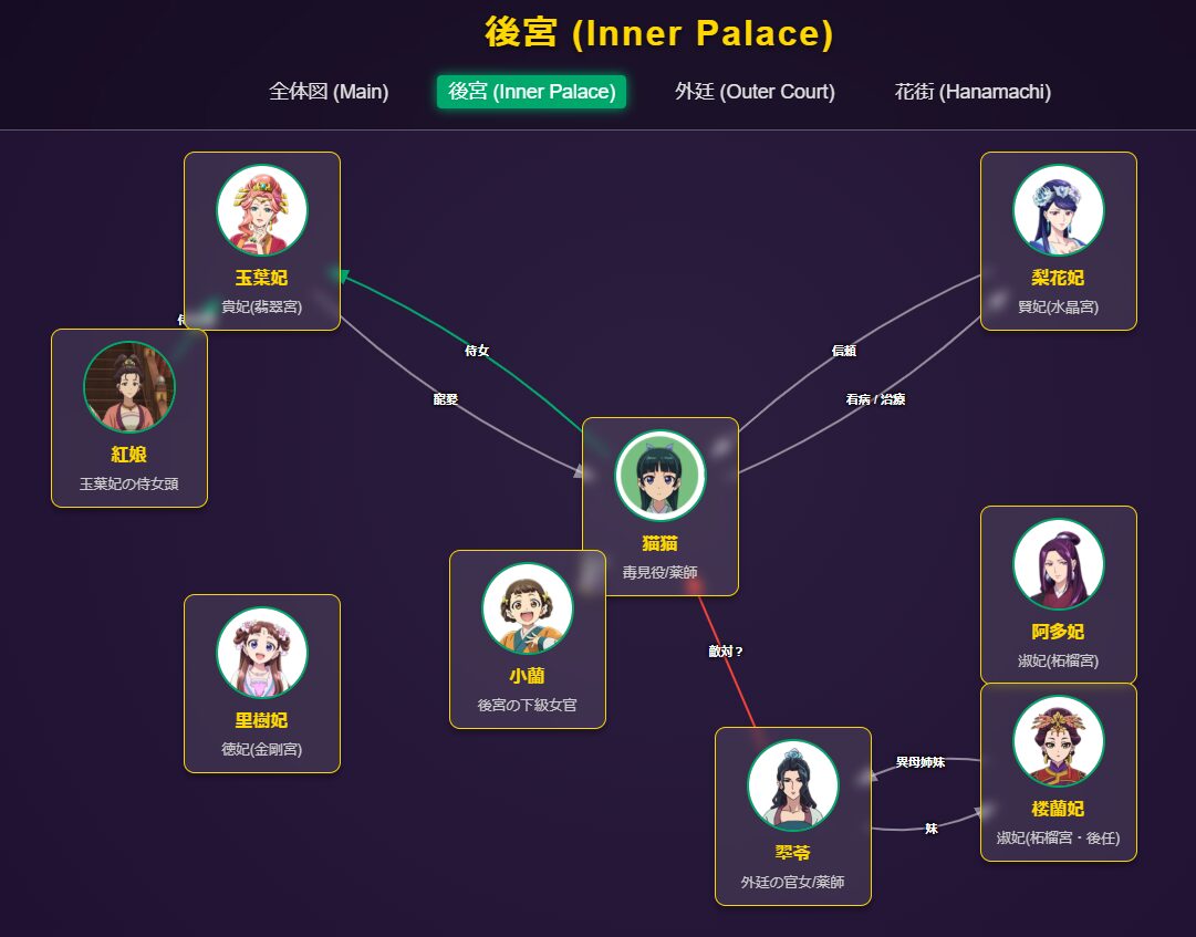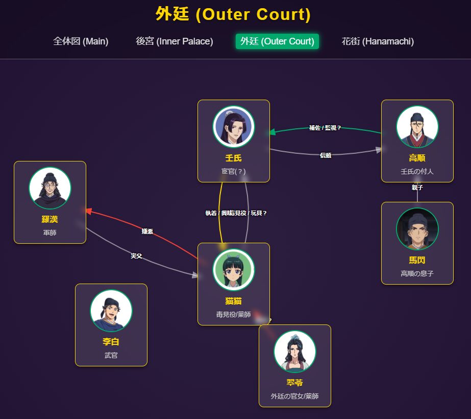 | 皇族 | 皇帝、壬氏、皇太后、阿多妃 | 全ての中心。出生の秘密や後継者争いが火種。 |